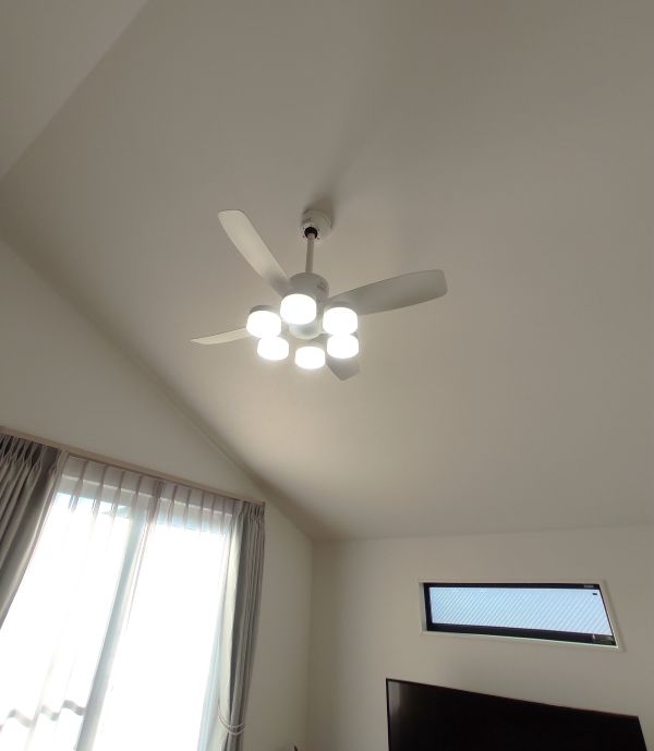 今回は戸建てリビングの傾斜天井にシーリングファンライトを設置しました。